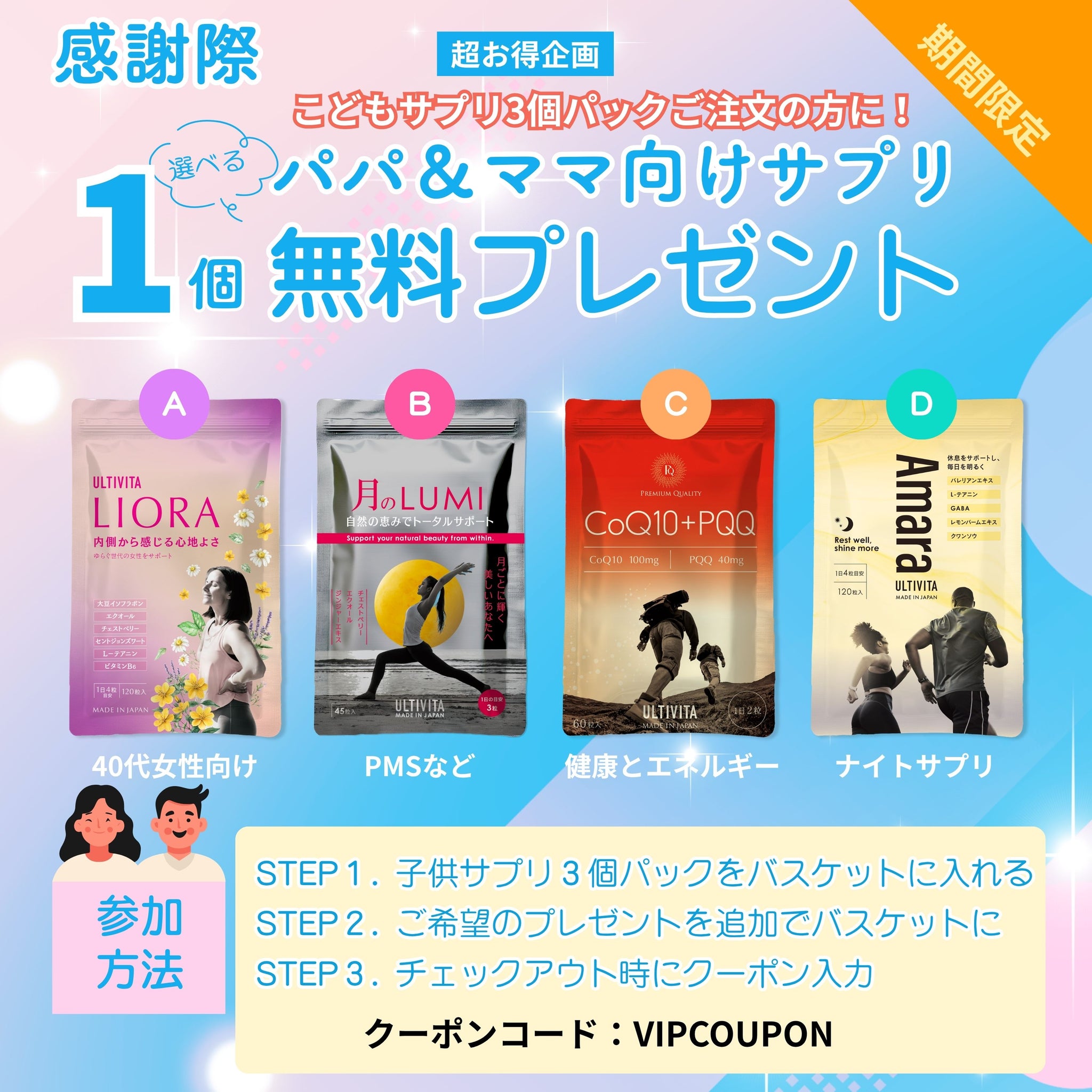 小学生マルチビタミン3個セットをご購入される際に以下のコレックションから一つの商品を無料でお試し出来ます。
