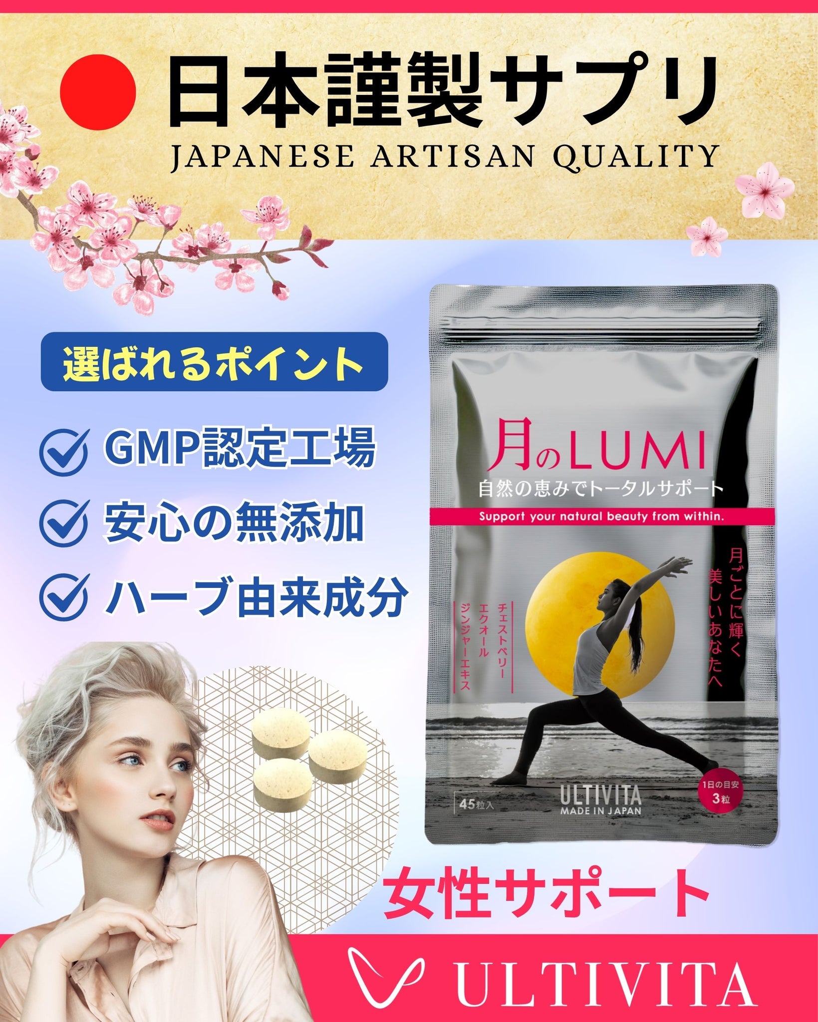 月のLUMIは、毎月のゆらぎに寄り添いたい方のために設計されたサプリメント。